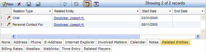 The Related Entities tab displays related entities and relation types. For example, the related entity could be a specific individual or company, and the relation type could be that of client, partner, associate, supervisor, and so on. An inverse relationship is automatically created. You can add unlimited related entities per entity. The Related Entities tab also allows you to open another Entities notebook for any of the related entities to edit information.